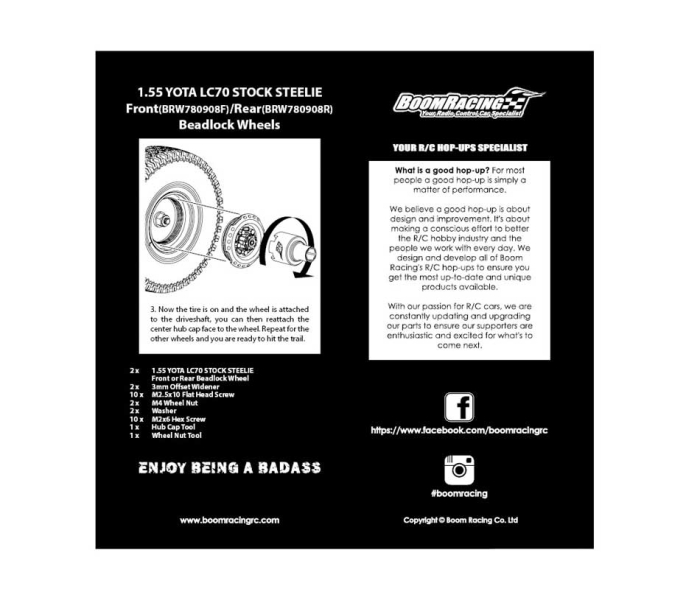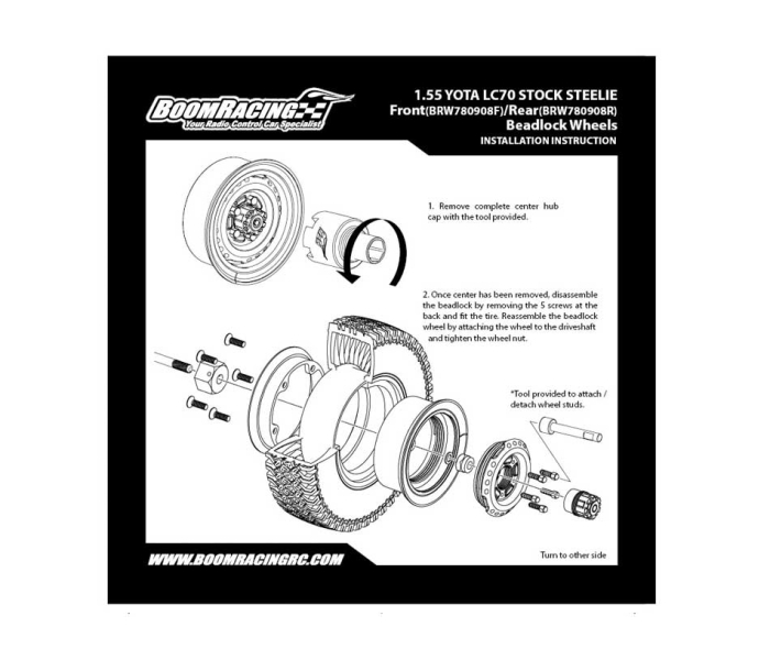 This product includes two rear beadlock wheels, a special tool to attach/detach the center hub design, another tool for the 5 lugs, the center wheel caps, 3mm wideners and all hardware.