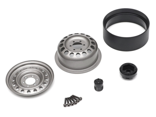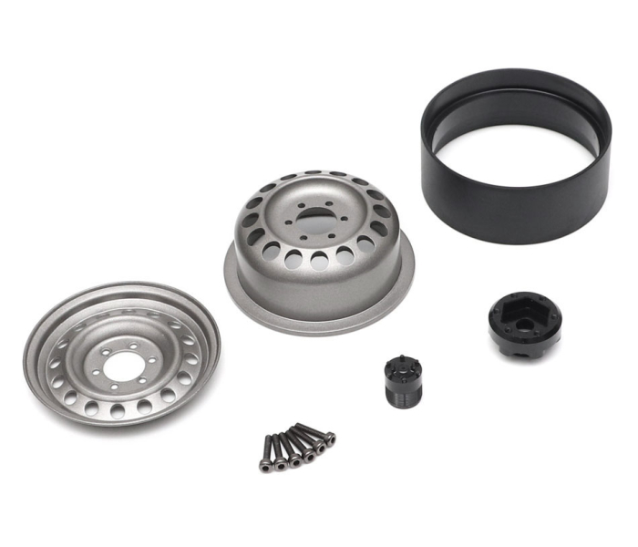 The front face is made of pressed steel for accurate scale looks. Comes with aluminum center rings and the back wheel piece is made from cast metal.
