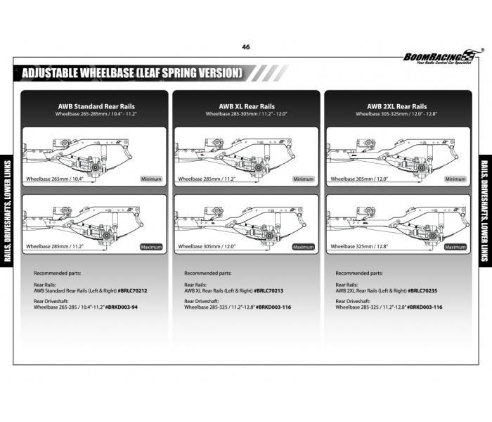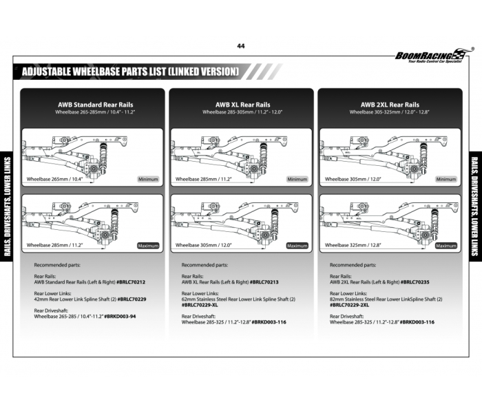 Recommended KUDU shaft sizes for the BRX01 AWB based on different wheelbase lengths: