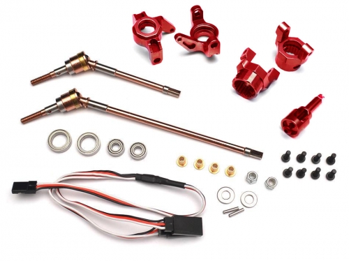 With this kit you can convert your Axial Wraith to 4 wheel steer. It comes with everything you need apart from a servo mount and steering links rod (available separately)