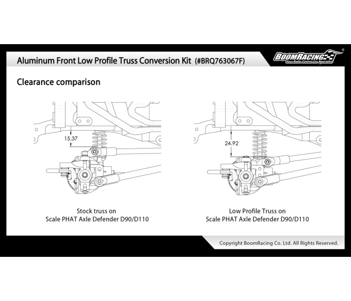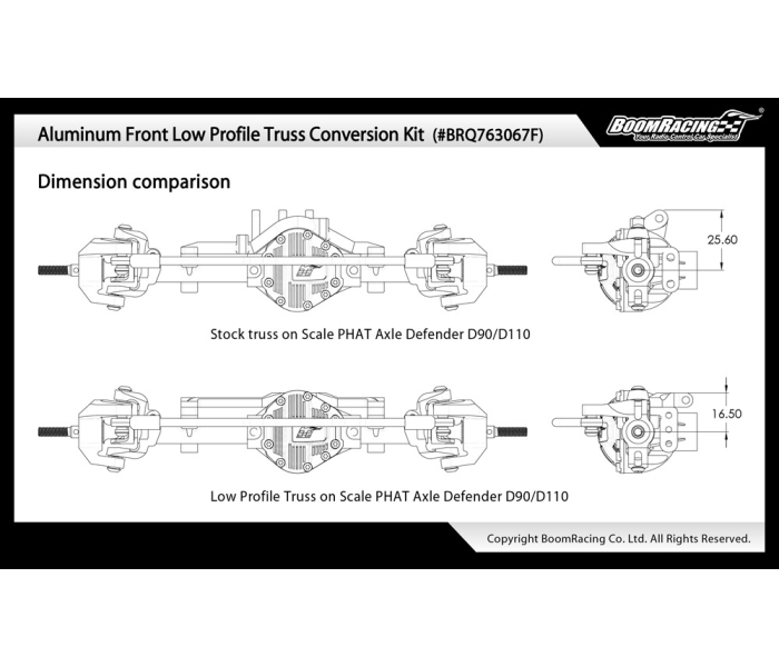 This Front Low Profile Aluminum Truss Conversion Kit gives you additional clearance and shock travel for front axle of Team Raffee Co. D90/D110.