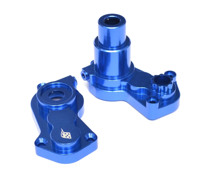 Made of T-6061 aluminum, billet machined, harder and stronger than stock, less play and tighter tolerance overall which gives it less flex and movement. The gearbox fits the stock gearbox.