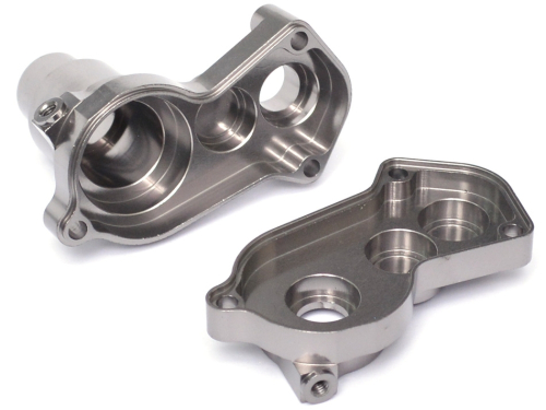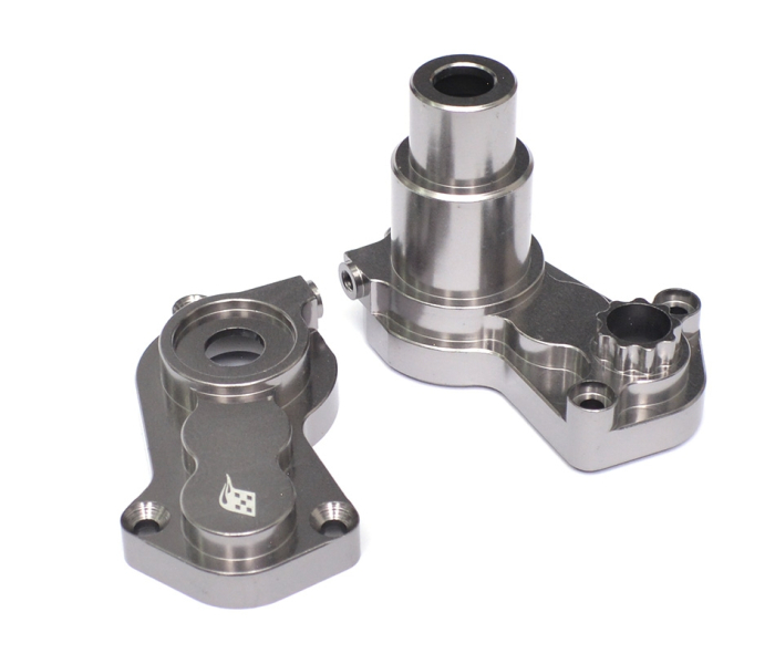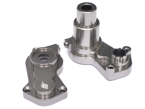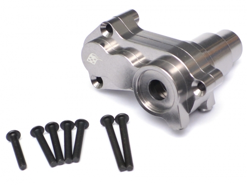 Made of T-6061 aluminum, billet machined, harder and stronger than stock, less play and tighter tolerance overall which gives it less flex and movement. The gearbox fits the stock gearbox.