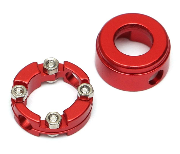 Grub screw pin taps into the driveshaft. The red collar rings are not threaded and are for scale looks.