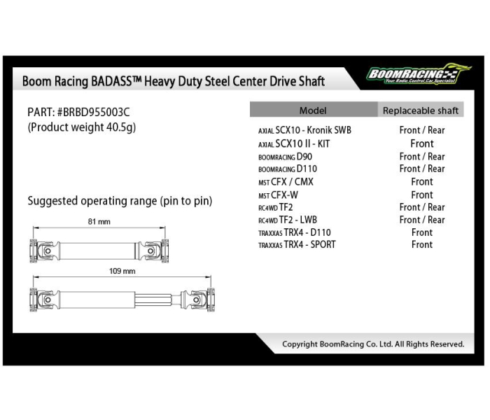 BADASS™ HD Steel Center Drive Shaft Set for Boom Racing D90/D110 Chassis Front & Rear (2) [Recon G6 Certified]