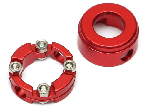 Grub screw pin taps into the driveshaft. The red collar rings are not threaded and are for scale looks.