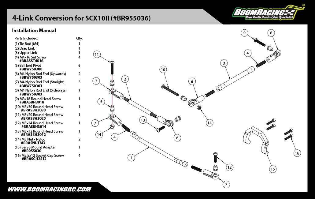 This is a 4-link Conversion Kit for the Axial SCX10.2. This conversion kit works with Boom Racing PYTHON Servo.