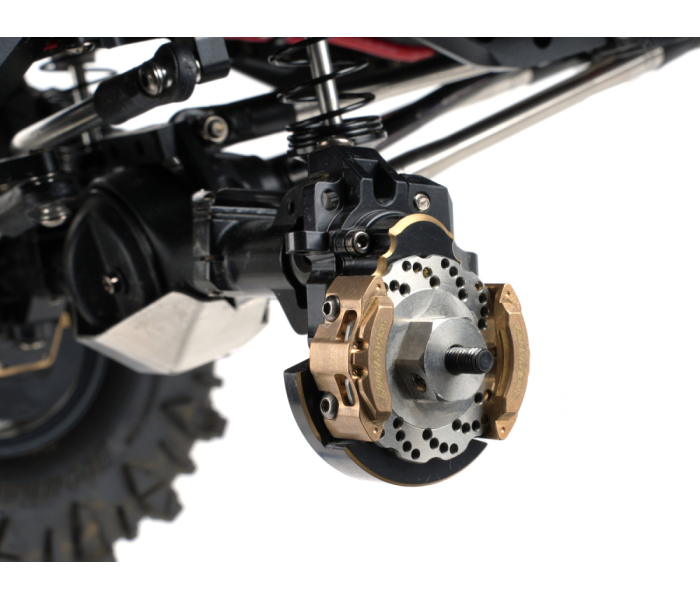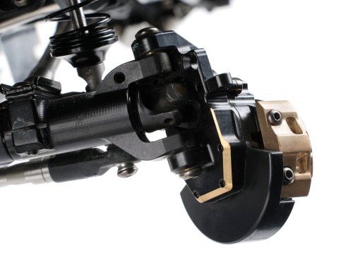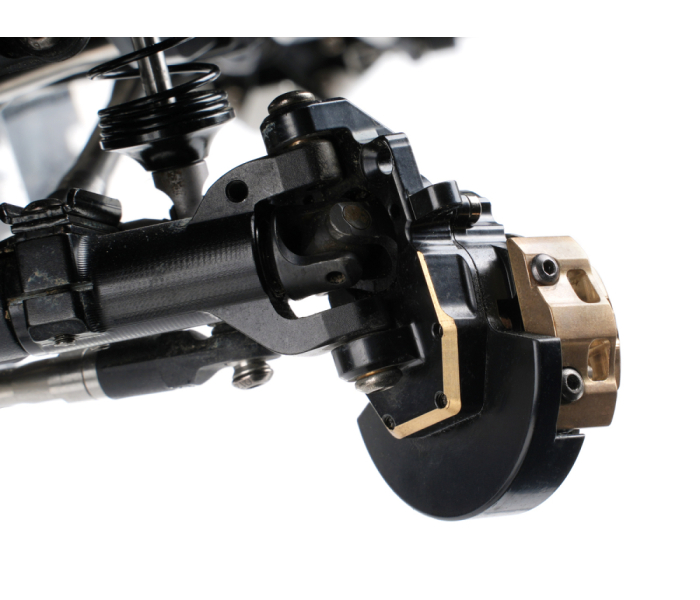 This is a set of front brass knuckles and front brass portal covers. Anodized in black with raw brass gold trims. They add weight to the bottom of the truck, which keeps the center of gravity as low as possible. Weighs a total of 130.9 grams.