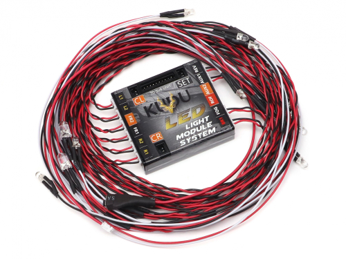 This is a complete LED light system for the Boom Racing BRX02 Land Rover Series III. This set includes a main LED light unit, a sub unit, a main connecting cable connecting the main and sub units, a set switch cable, a battery cable (2s), a buzzer (for reverse and low voltage detection), 10 LED light cables, and a user manual.