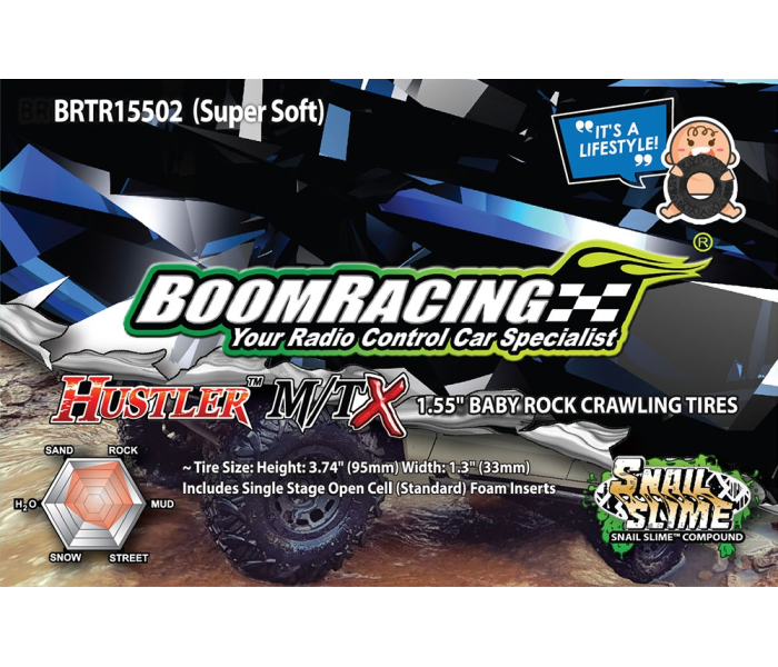Boom Racing developed the BABY HUSTLER so that you can run a great tiny tire with great performance on the trail. The BABY tire lugs act as little claws and grab onto any surface they come in contact. With these tires there is less chances for drivers to look for alternative drive lines.