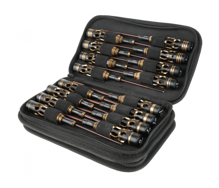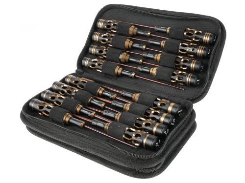 This KUDU tool bag is compact and specially configured to hold many tools. It can fit up to 16 standard-sized RC tools, plus 16 smaller-sized tools, and an additional compartment for other special tools (such as shock pliers).