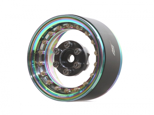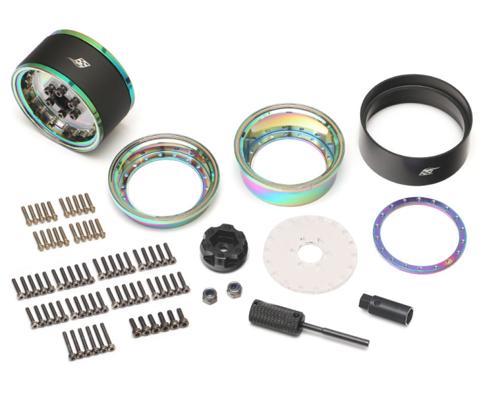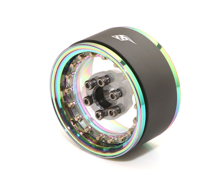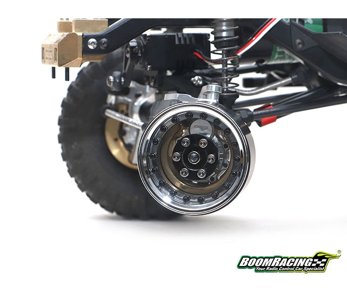 This is ProBuild 1.9" CAL 6-Lug Adjustable Offset Neo Chrome / Clear Beadlock Wheels (2). The Boom Racing ProBuild wheels use a patented design for quick and easy installation and setup.