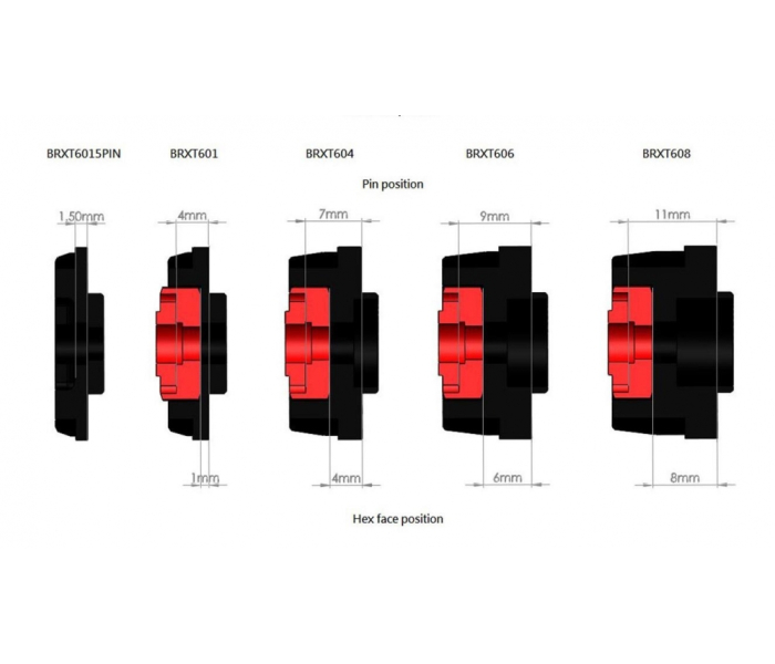 - VT8 12mm Alum Hex for wheel shafts using 6mm Shaft (at wheel pin) and 5mm (threads) #BRT10054