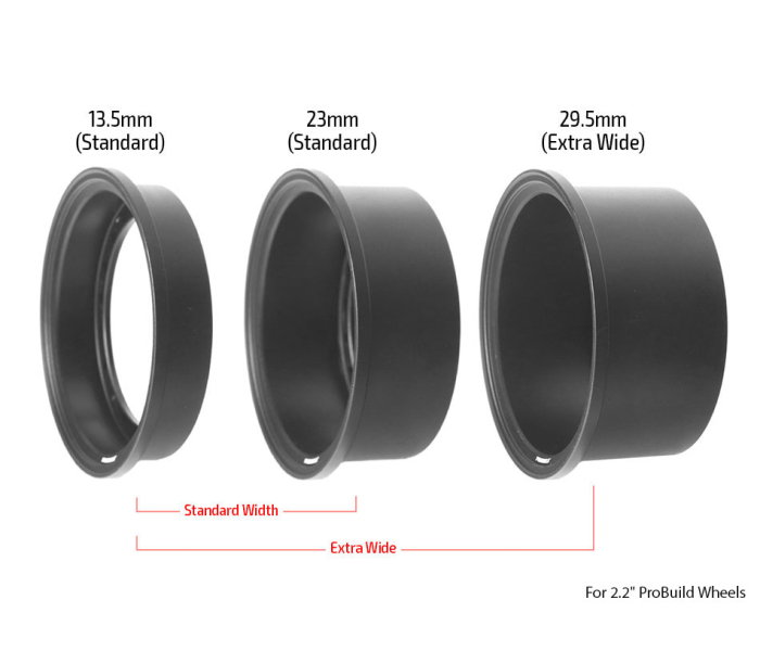 This is a ProBuild™ 2.2" Aluminum 13.5mm wheel barrel. This is the base side of the beadlock wheel. ProBuild 2.2" (standard width) wheel uses one 23mm and one 13.5mm wheel barrel each, and the extra wide version uses one 29.5mm and one 13.5mm wheel barrel each. Requires four to complete four wheels for one car.
