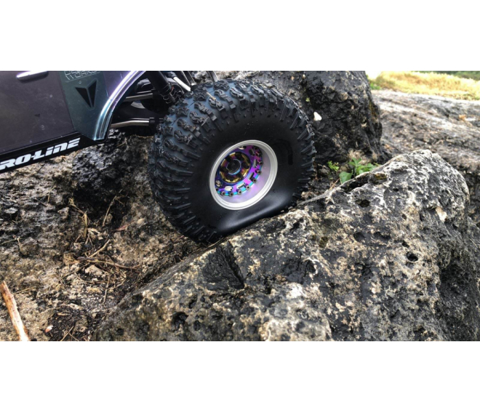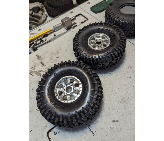 This is a pair of REDEEMER™ 1.9" GEKKO™ RED RC crawler tires with Rock Monster™ Green (super soft) foam inserts.
