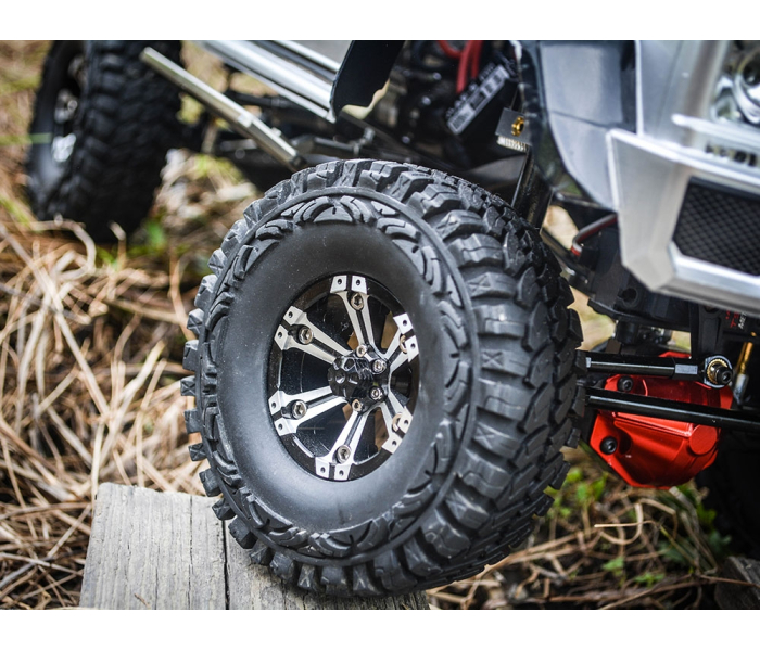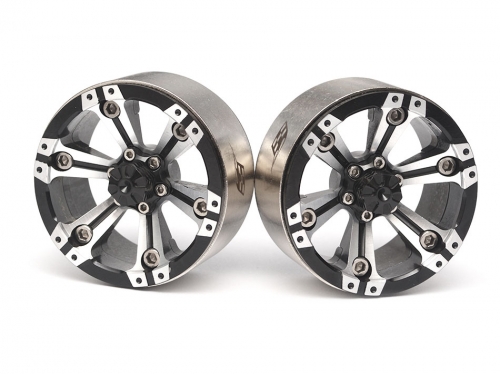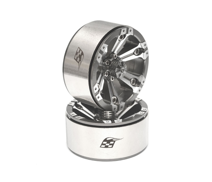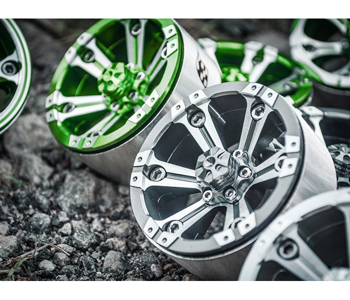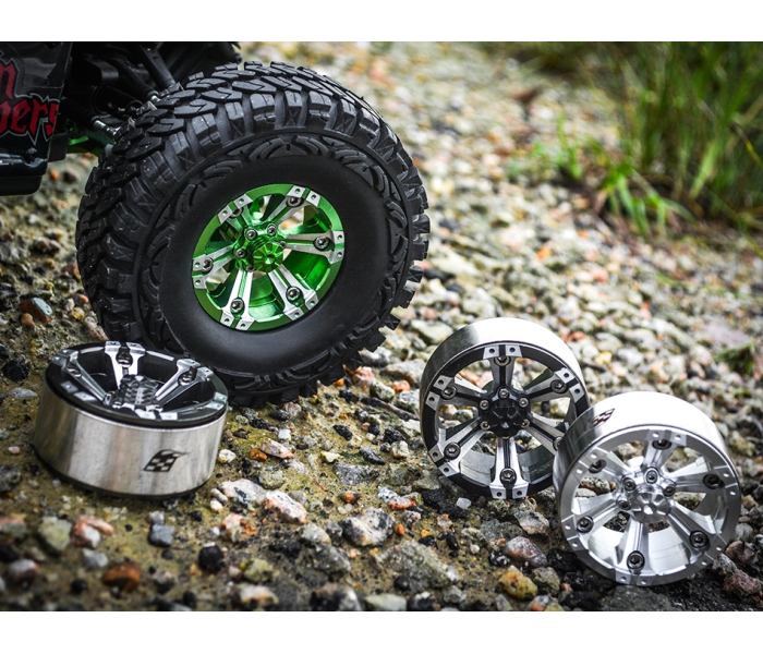 Packing 115g of extra weight per wheel, these monster wheels are compatible with a wide range of 1/10 crawlers, such as the Axial SCX10, Wraith, or TF2. CNC-machined from aluminum. Available in a range of styles. Anodized finish available in metallic green, black, silver or gunmetal colors.