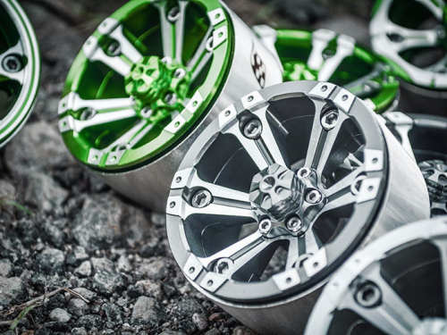 1.9" (48mm) heavy-duty anodized aluminum six-spoke beadlock wheels from Boom Racing.